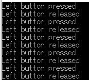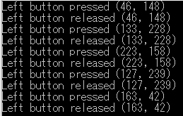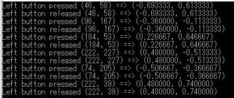 - 実行し,描画ウインドウ内でマウスをクリック&リリースするとコマンドプロンプトにつぎのようにクリックした座標が表示される.