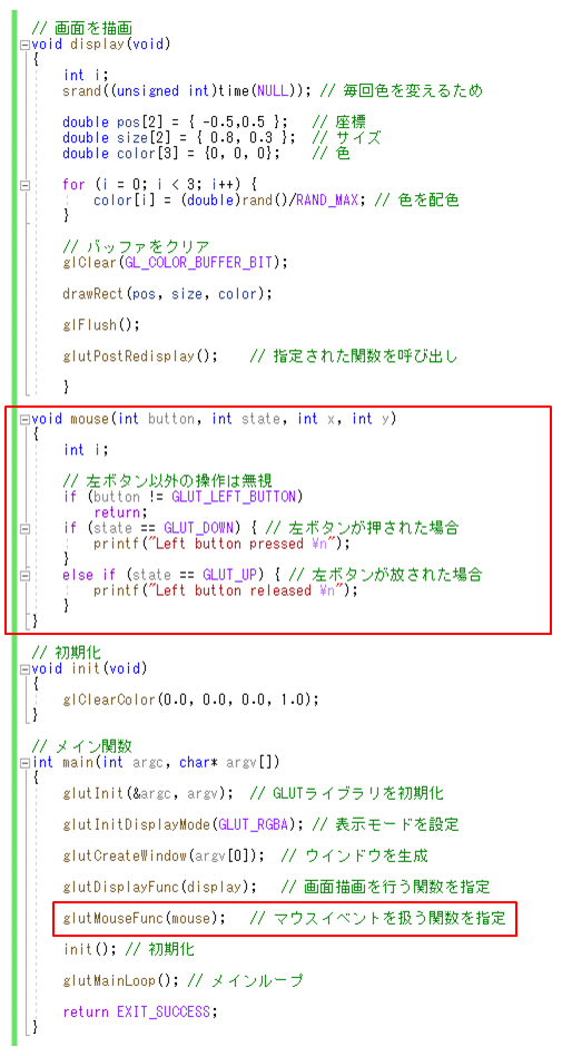 - マウスを利用する場合は、glutMouseFunc()にマウス操作イベントハンドラ関数mouse()を登録する。