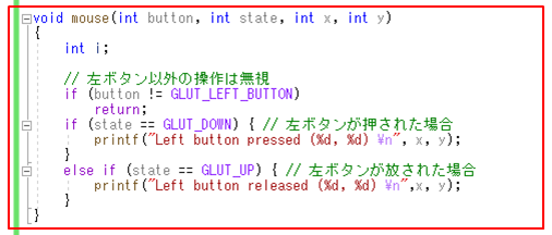 int state: ボタンを押した場合(GLUT_DOWN)、ボタンを離した場合(GLUT_UP)