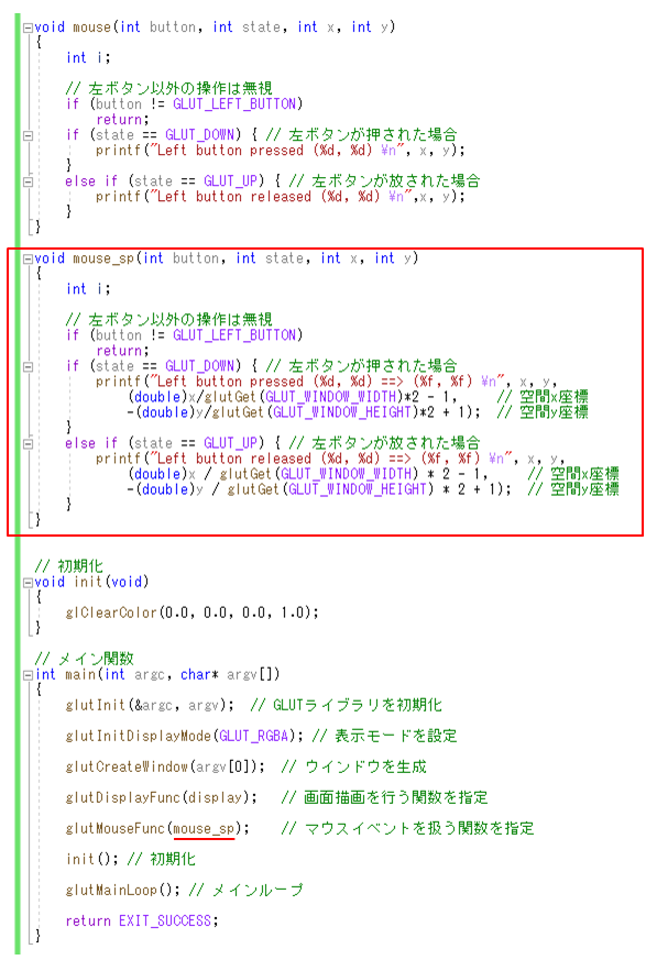 - また,main()関数の中にあるglutMouseFunc()関数の引数をmouseからmouse_spに変更しておく.