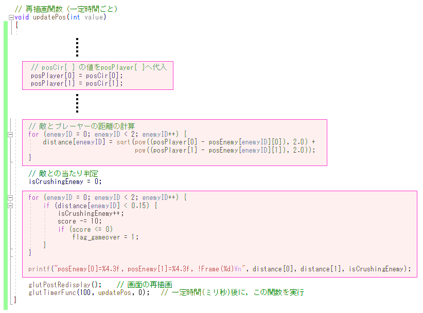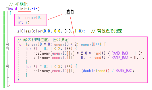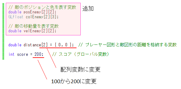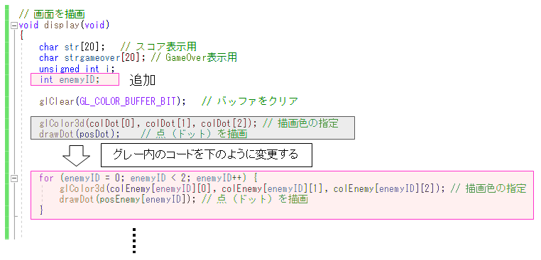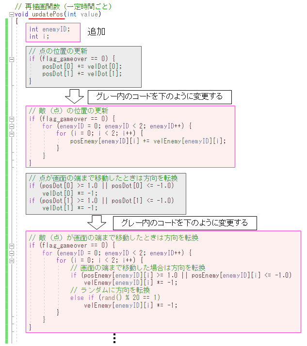 - 上記のソースコードの箇所以外も敵の個数が3個(defineで設定した個数)に対応するように修正しなければならない。
