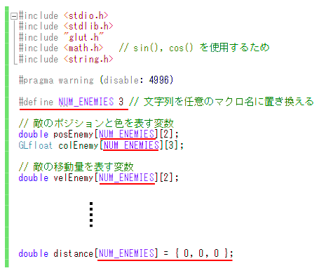 演習12.1を修正し、defineを使用して敵の数を3個にせよ。