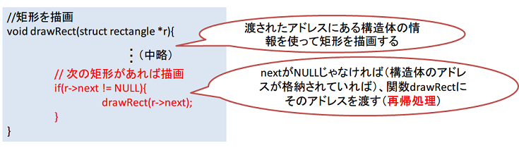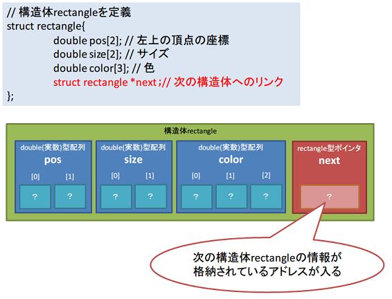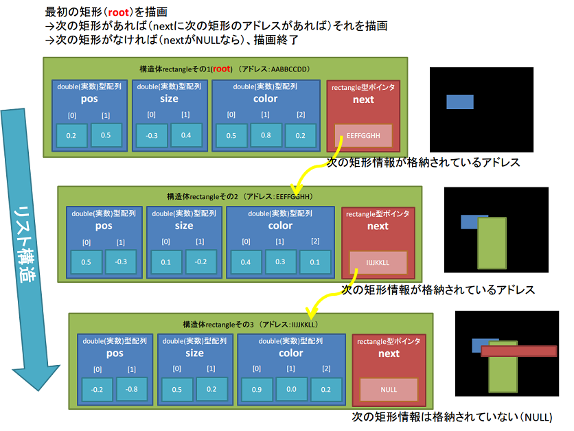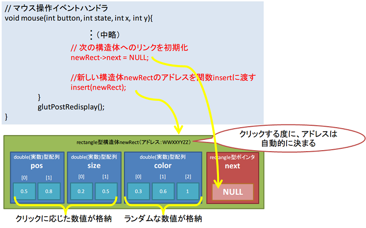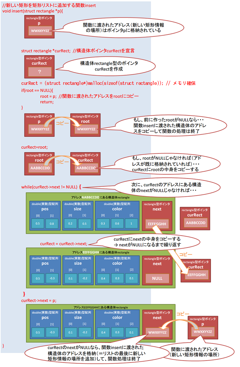 3. 新しい矩形情報(rectangle型構造体newRect)が作られる度に、nextを初期化して、アドレスを関数insertに渡す