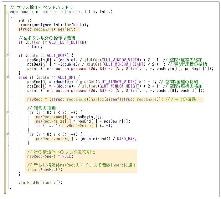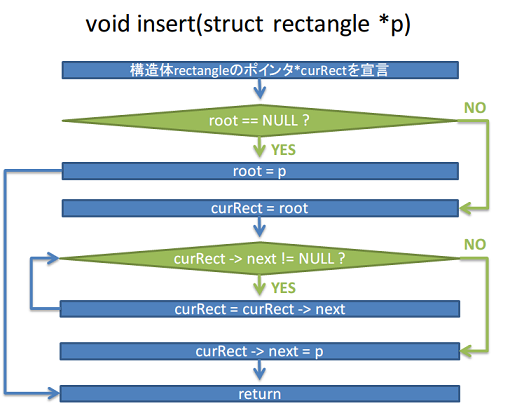 4.新しい矩形情報(rectangle型構造体newRect)を矩形リストに追加する関数insertを作成する(ソースコードは赤字の部分)