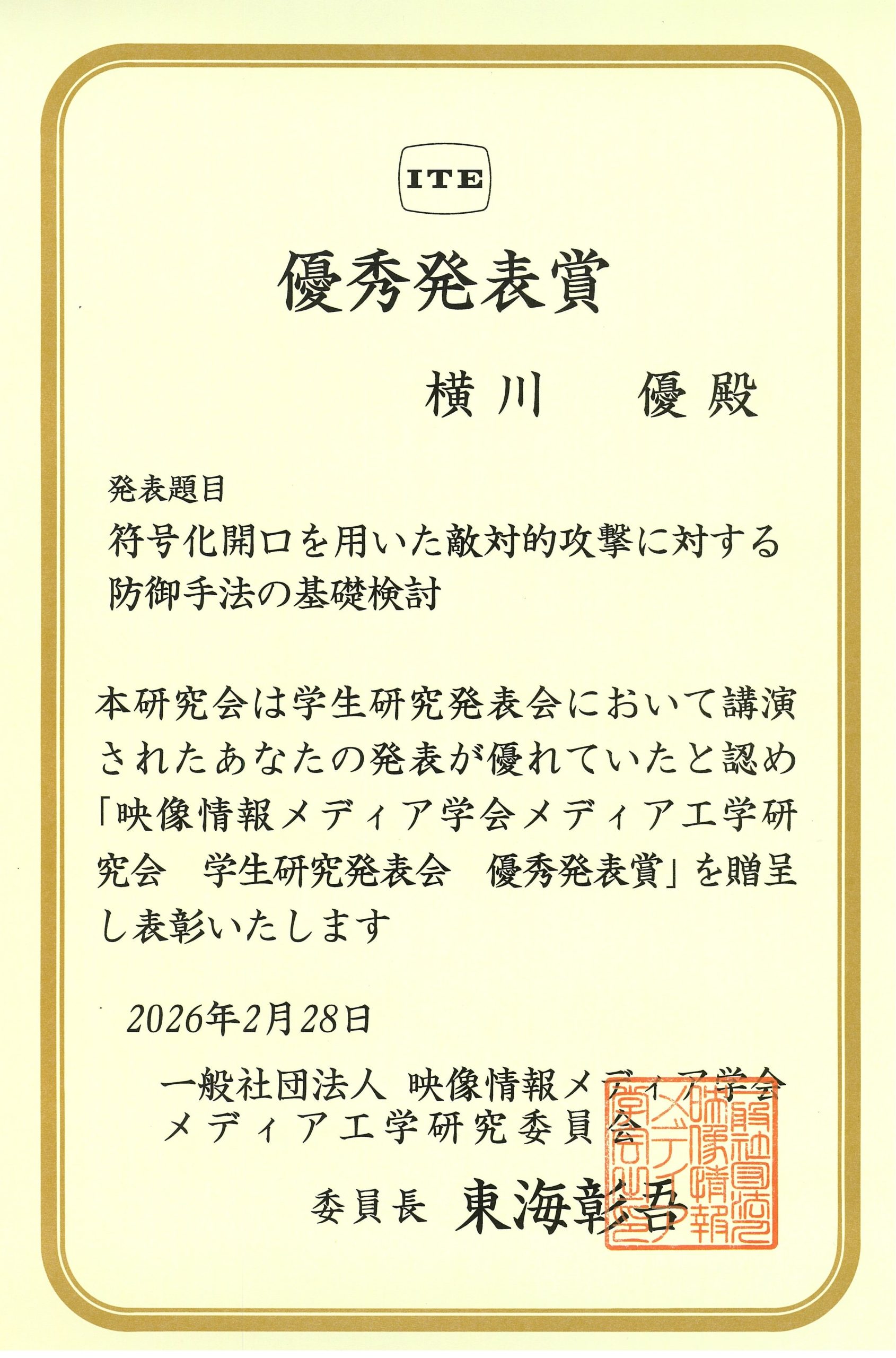 2026年2月28日(土)にオンライン形式にて開催された「2025年度映像情報メディア学会メディア工学研究会 (ME) 学生研究発表会」において、情報・生体工学プログラム博士前期課程2年の横川優さん(指導教員:小野智司教授)が「優秀発表賞」を受賞しました。同賞は、全講演者(14名)のうち優秀な発表を行った2名に授与されました。