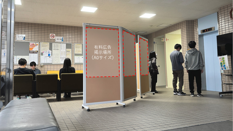 現在、有料広告(ポスター)を全8箇所で募集しています。掲示場所は、学生の往来が多い情報・生体工学棟1階玄関ロビーで、下図のように掲示されます。