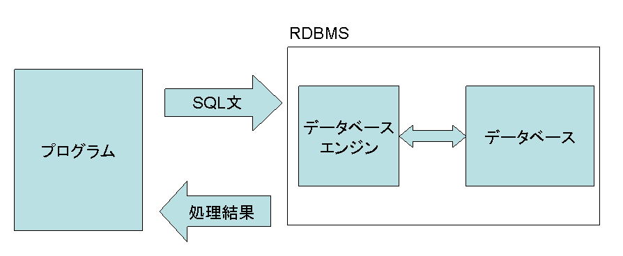 SQLによるデータベース処理のイメージを図1に示します.まず,プログラム側において,どのような条件でデータを処理するかをSQL文として組み立てます.次に,組み立てたSQL文をデータベースエンジンに対して発行します.SQL文を受け取ったデータベースエンジンは,その内容を解釈して,データベース本体に対し,抽出や並べ替えなどの処理を実行します.最後に,処理の結果だけをプログラムに返し,終了します.