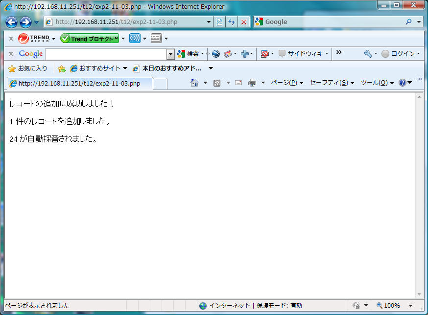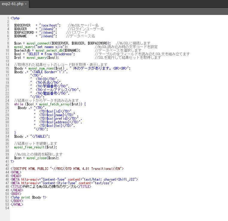 また,確認のために,先ほど作成したexp2-61.php をブラウザから開き,自分のレコードが追加されているか確認してください.