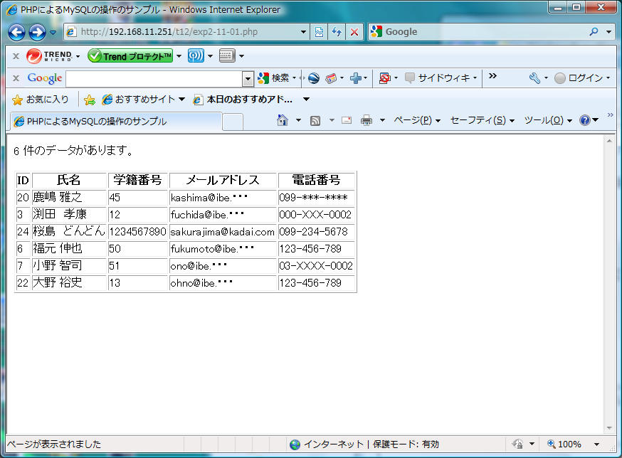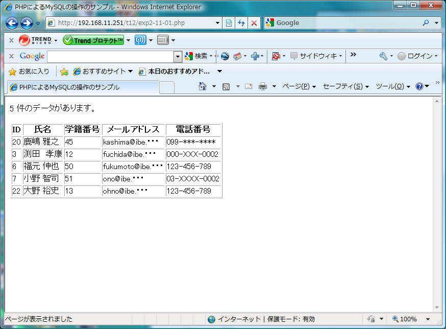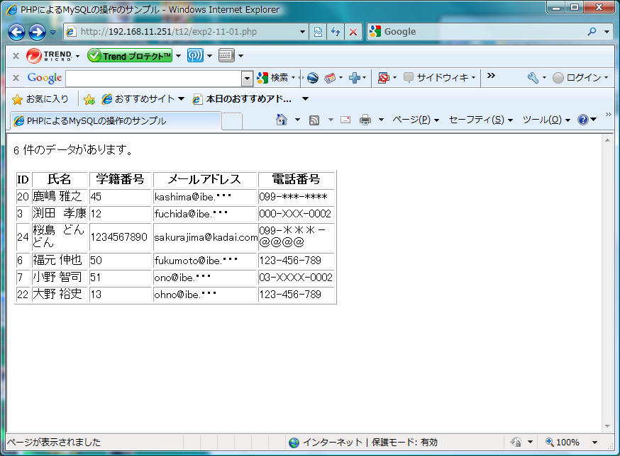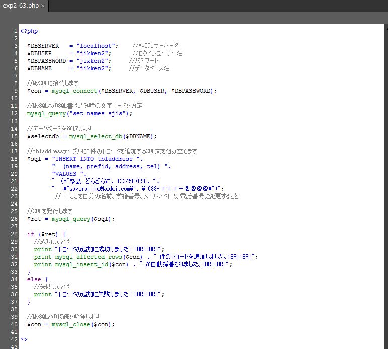 サンプルプログラム exp2-63.php を参考にして,データベースに自分の名前,学籍番号,メールアドレス,電話番号(でたらめでOK)を追加してください.