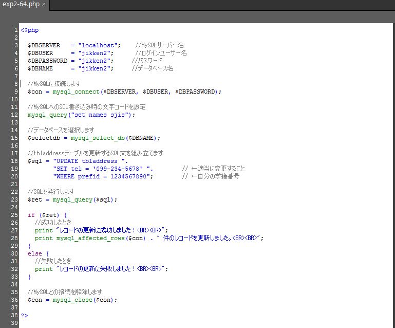 レコードの更新はupdate文によって行います.サンプルプログラム exp2-64.php を参考にして,自分のレコードの電話番号(適当)の項目を変更してください.ここで作成したスクリプトでは,キーとしてprefid(学籍番号)を用いています.間違えないように,自分の学籍番号をキーとして指定してください.