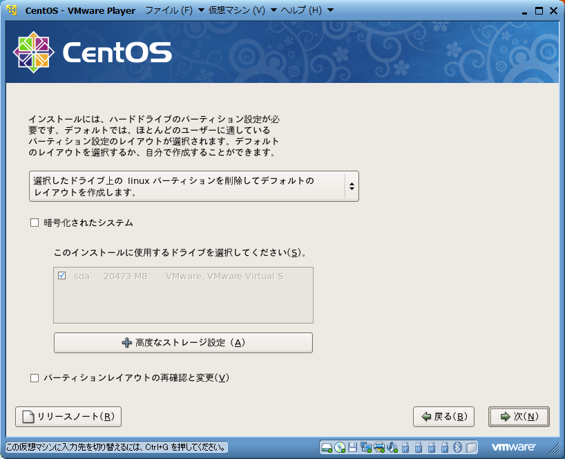 | 仮想ハードドライブ全体にLinuxをインストールし,デフォルトのレイアウトを作成すること. | |