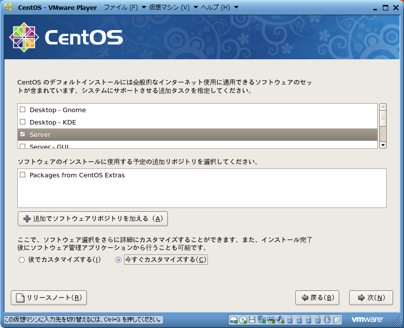 | セットアップ中に,「インストール設定」という設定項目で,「デスクトップ」「サーバ」などの項目を選択するよう指示を求められる.本実験では,「Server」のみを選択すること.また,このとき「今すぐカスタマイズ」を選択しておくこと. | |