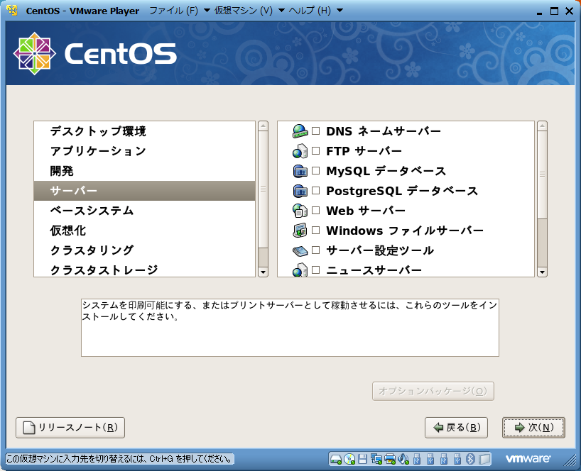 | インストールするパッケージをカスタマイズする項目で,「サーバ」欄の全てのサービスのチェックを外すこと. これは,下記の実験3において,手動でサービスをインストールする実験を行うためである. | |