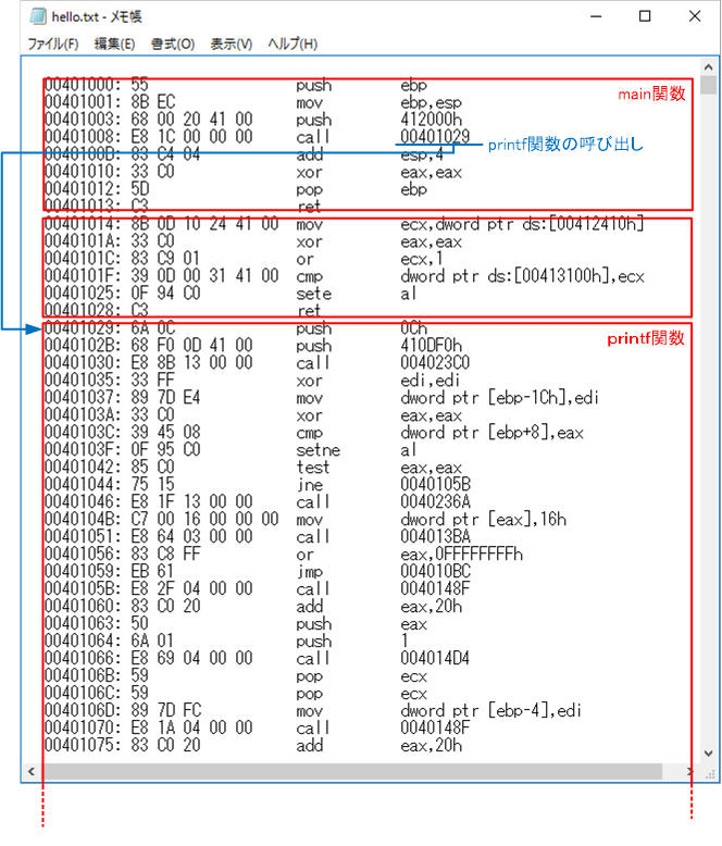 00401000: 55 push ebp 00401001: 8B EC mov ebp,esp 00401003: 68 00 B0 40 00 push 40B000h<<Hello Worldの文字列の先頭アドレス 00401008: E8 07 00 00 00 call 00401014<<printf関数の先頭アドレス 0040100D: 83 C4 04 add esp,4 00401010: 33 C0 xor eax,eax 00401012: 5D pop ebp 00401013: C3 ret