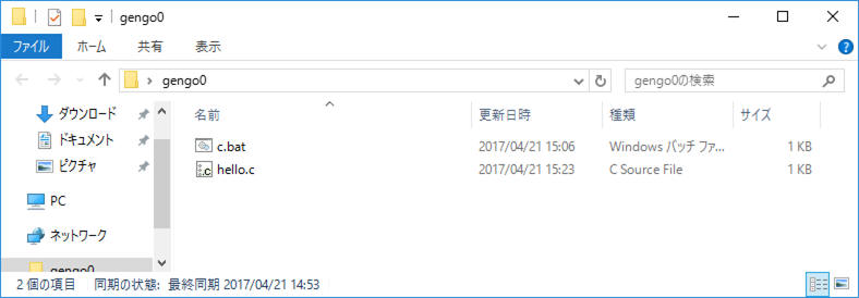 確認:ソースファイル名がhello.cになっていることを確認してください。