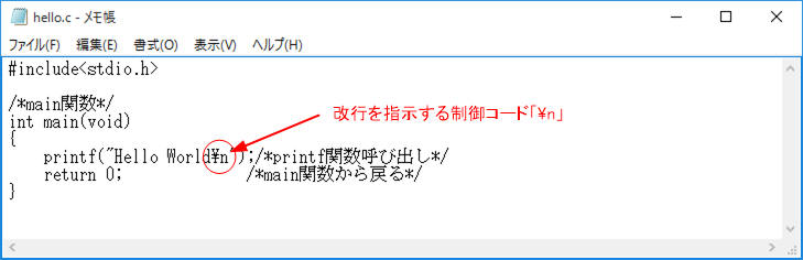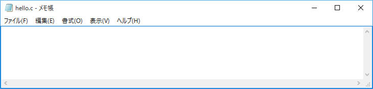 まずWindowsの標準のテキストエディタ notepad(メモ帳)を使って、ソースファイルhello.cを作ることにします。次の太字の部分を書き込んでEnterキー(改行に使うキーです)を押してください。