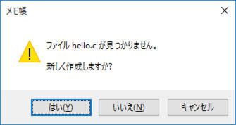 hello.cの名前のファイルが無いときは次のように新しく作るか聞いてきますから「はい(Y)」で作ってください。