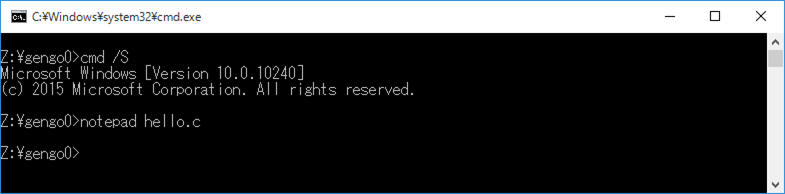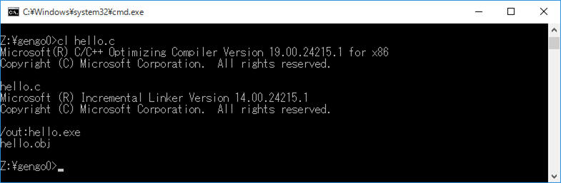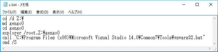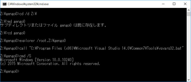 cd /d Z:\ md gengo0 cd gengo0 explorer /root,Z:\gengo0 call "C:\Program Files (x86)\Microsoft Visual Studio 14.0\Common7\Tools\vsvars32.bat" cmd /S