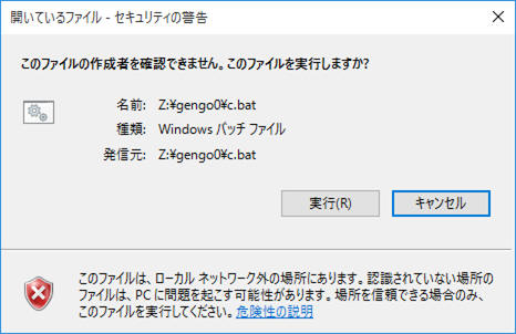 演習室の環境ではデスクトップでバッチプログラムを実行できません。c.batをZドライブのgengo0フォルダに入れてから実行してください。c.batを実行すると次の警告が出ますが かまわず実行します。