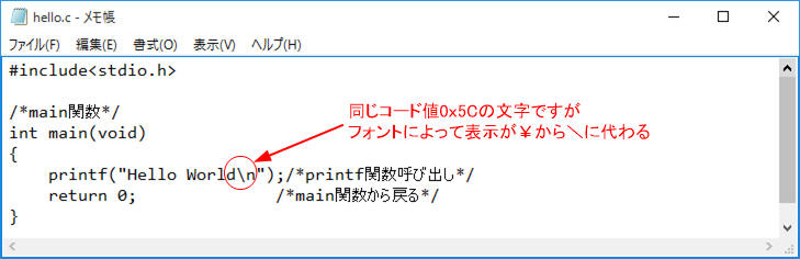 ※計算機の中では文字は文字コードと呼ばれる数値で表現されています。米国のASCIIコードと日本のJISコードは16進数の5C(十進数では92)に異なる文字「\」と 「¥」を対応させているので、このような違いが起こります。C言語を機械語に翻訳するコンパイラはフォントではなくて、コード値を読みます。人には違って見えますが計算機には同じに見えるのです^^.;