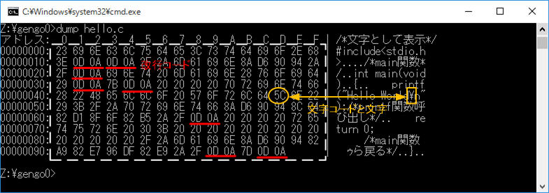 C言語処理系はCプログラムの文字の形を見て翻訳するわけではありません。ソースファイルのバイトデータの並びを見て翻訳します。中身を16進数として見てみましょう。自作のC言語で作ったプログラムdump.exeを用意しました。