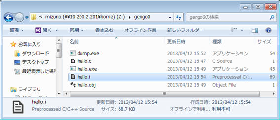 次のようなコマンドで前処理だけ行うと。結果をhello.iという名前のファイルに書き出します。