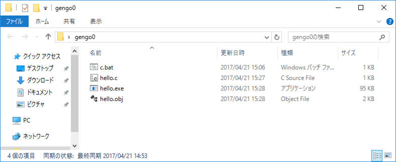 確認:hello.cのファイルと同じ場所にhello.objとhello.exeが出来ていますか?