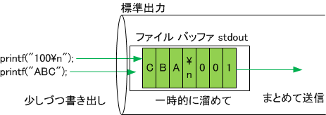 ※標準出力のファイル・バッファに書き込むところまでがputchar関数の処理範囲です。