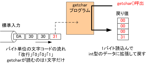 ※戻り値がcharよりも広い範囲の値を持てるint型なのでputchar関数内でエラーが起きた場合も戻り値で示せる。