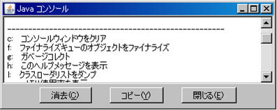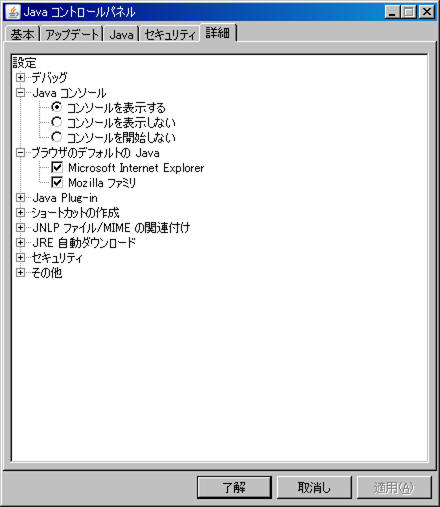 開くウインドウの詳細タブを選んでJavaコンソールで表示するを選ぶ。