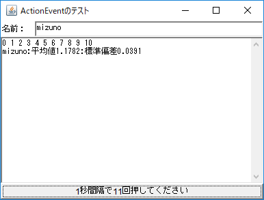import java.awt.*; import java.awt.event.*;/* 注意:java.awt.*はjava.awt.event.*を含みません */ public class TestActionEvent extends Frame implements ActionListener { static public void main(String args[])//テスト用 { TestActionEvent frame=new TestActionEvent(); frame.init(); frame.setSize(400,300); frame.setVisible(true); frame.addWindowListener(frame.new Control()); } class Control extends WindowAdapter{ public void windowClosing(WindowEvent e){ System.exit(0); } } Button button=new Button("1秒間隔で11回押してください"); TextField textfield=new TextField("挑戦者の名前をここに"); TextArea textarea=new TextArea(); long data[]=new long[11]; int counter=0; // public TestActionEvent() { super("ActionEventのテスト"); } public void init() { Panel panel=new Panel(); panel.setLayout(new BorderLayout()); panel.add(new Label("名前:"),BorderLayout.WEST); panel.add(textfield,BorderLayout.CENTER); // add(panel, BorderLayout.NORTH); add(button, BorderLayout.SOUTH); add(textarea, BorderLayout.CENTER); //イベントソースのボタンやフィールドにイベントリスナーを登録 button.addActionListener(this); textfield.addActionListener(this); } //インターフェイスActionListenerの実装部分 //2箇所からイベントが送られてくるためif文で選別することが必要 public void actionPerformed(ActionEvent ev){ Object source=ev.getSource();//どこで発生したイベントなのかを見て分枝 if(source==textfield){//テキストフィールドからの場合 textarea.append(textfield.getText()+"さん 下のボタンを1秒間隔で11回押してください "); counter=0; }else if(source==button){//ボタンからの場合 textarea.append(""+counter+" "); data[counter]=ev.getWhen(); if(counter==10){ //平均値 textarea.append("\n"+textfield.getText()+":"); double average=(data[10]-data[0])/1000.0/10; textarea.append("平均値"+average+":"); //標準偏差 double rr=0; for(int i=0;i<10;i++){ double r=(data[i+1]-data[i])/1000.0-average; rr+=(r*r); } rr=Math.sqrt(rr/9); rr=((int)(rr*10000))/10000.0;//小数点以下4桁までに textarea.append("標準偏差"+rr+"\n"); counter=0; }else counter++; } } }