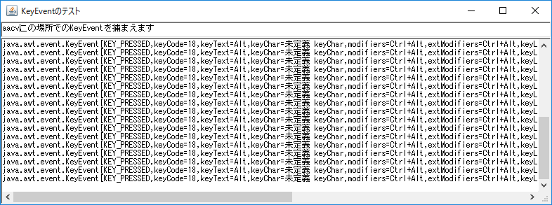 これを使ってKeyEventを受け取り送られてきたイベントを文字列に変換して表示するプログラムを作ってみました。まずはいろいろと試してください。