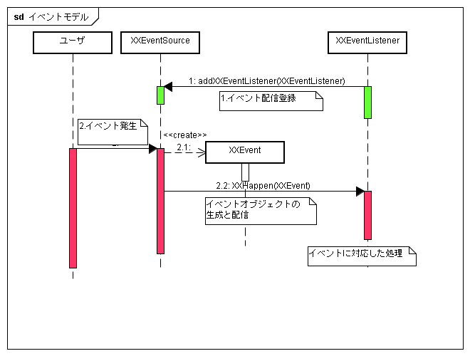 - イベントが発生するとイベントソースはイベントオブジェクトを生成しイベントリスナに 配信。