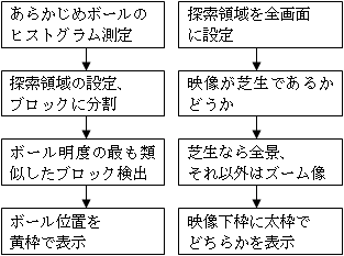 明度ヒストグラムを用いたボール追跡(左)、シーン検出(右)の各処理の流れを以下に示す。